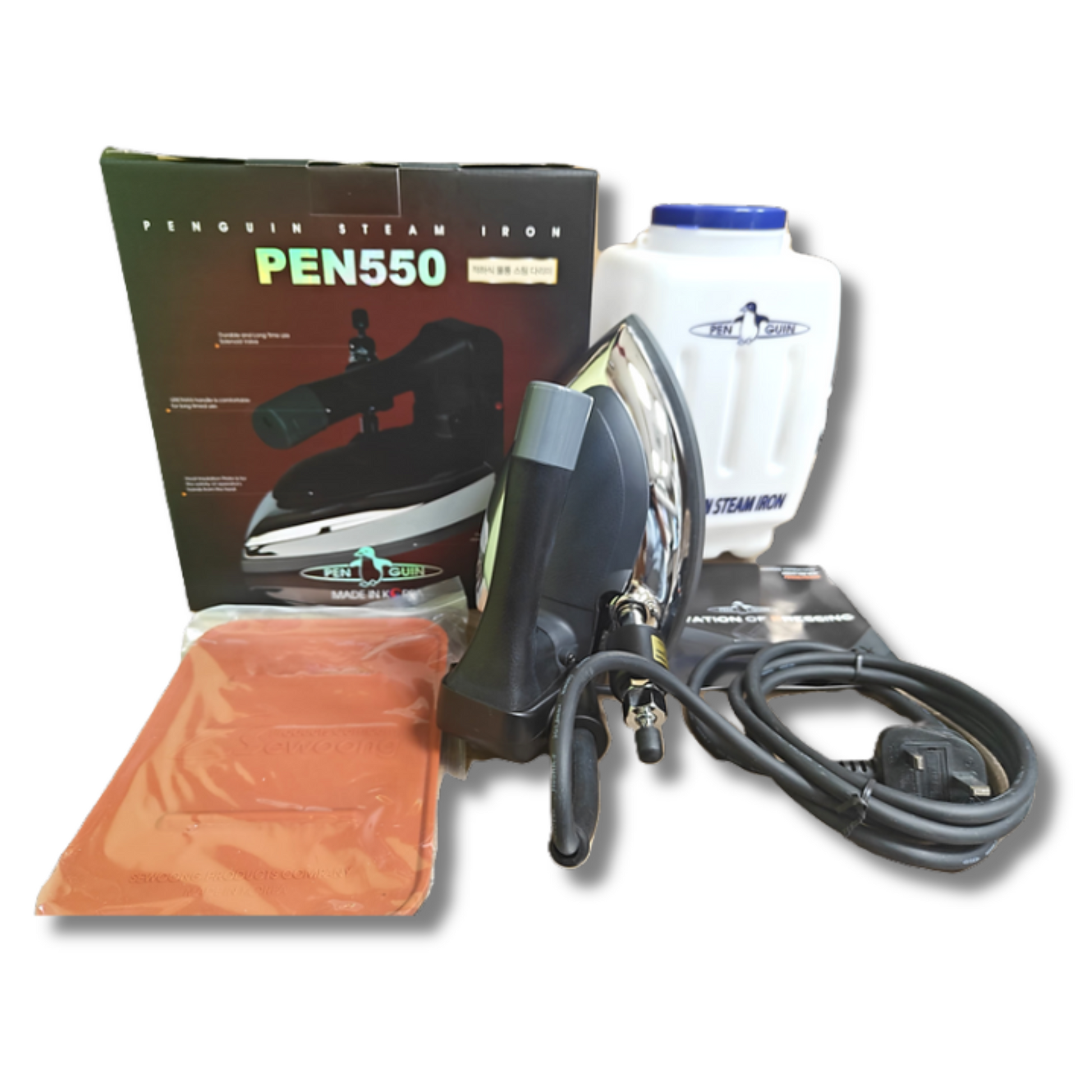 The Penguin 550E Gravity Feed Iron is a powerful, commercial-grade steam iron designed for tailors, fashion designers, and garment professionals who demand crisp, clean finishes. Its gravity-fed water system delivers consistent steam for hours without the need for pressurized tanks. With its durable construction, comfortable handle, and adjustable temperature settings, the 550E ensures top-tier performance in both commercial and home studios.